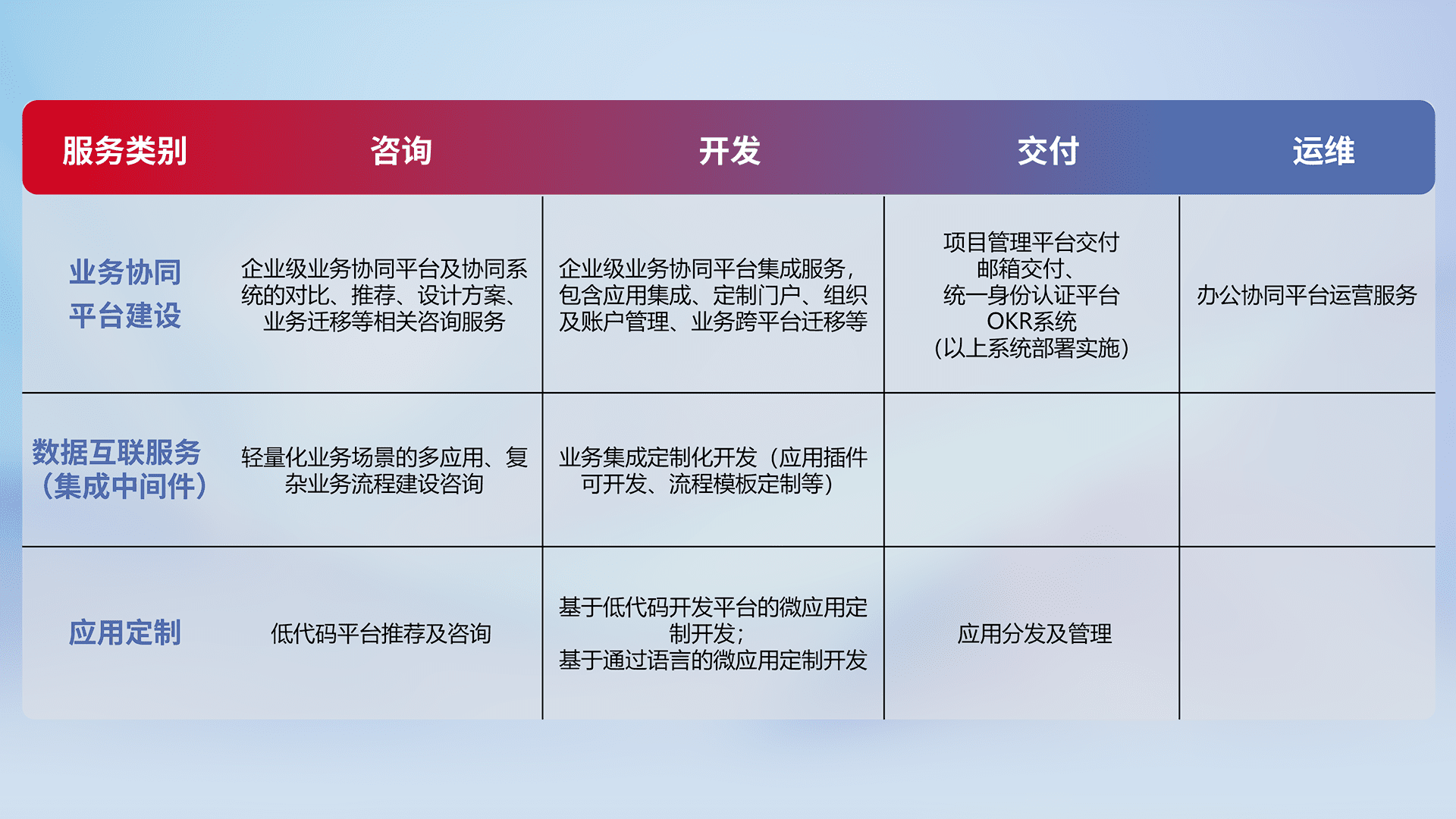针对钉钉、、、、企微、、IDaas等平台级产品提供产品的规划、、方案、、、交付、、、定制化开发等服务,,实现如统一协同办公、、智能客户服务、、、、混合会议管理、、、智能数据查询、、、、等业务场景,,实现数字化转型。。