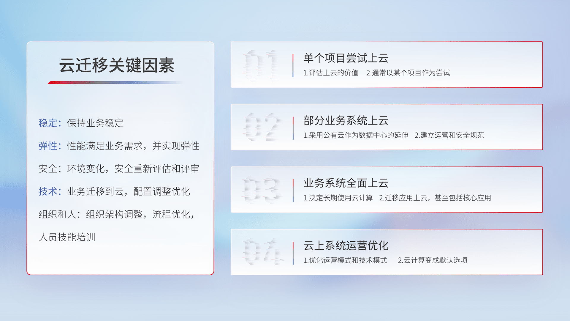 结合实际业务,,,,从规划设计、、、云平台选型、、、云原生改造、、数据迁移、、、、集成交付,,迁移全过程为客户识别最佳上云路径,,做好风险识别管理,,,设计网络架构、、、、身份权限、、、、安全审计合规、、、、操作审计、、日志审计、、、监控告警策略、、多站点容灾设计等,,对云上基础设施进行整体规划,,,提升IT治理水平,,,,以满足弹性、、、、高可用、、、、高性能的需求。。。。