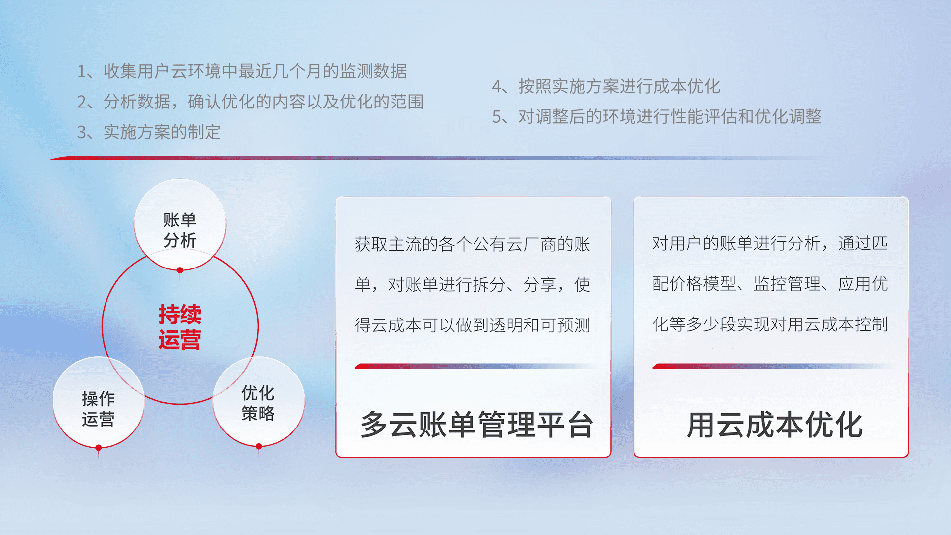 通过多云纳管,,以统一的资源数据模型把客户的云资源进行抽象和封装,,,进而实现对多云资源的统一操作,,保障云资源管理的可靠性、、、稳定性与可用性。。。。量身定制化运维内容,,配置、、、开发运维、、、、补丁管理、、、备份、、、、监控、、、、认证和访问管理、、审计和日常巡检等,,,保障在用云过程中的可靠度,,,稳定度以及高可用率。。